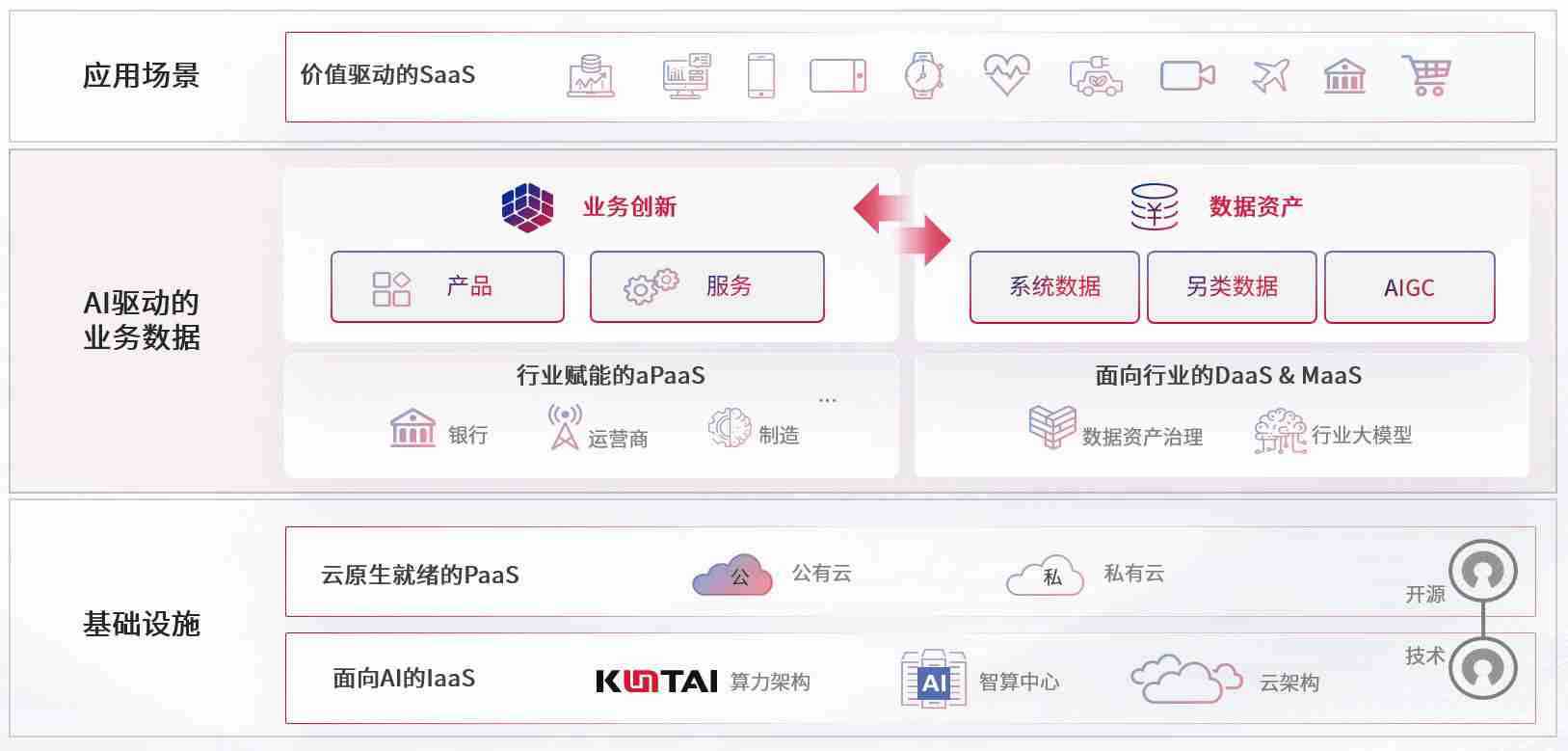 数字时代,,,,围绕企业数字化转型的关键要素,,尊龙z6数码开创性的提出数云融合战略和技术体系框架,,着力在云原生、、、数字原生、、、AI原生和信创产业上架构产品和服务能力,,,,为处在不同数字化转型阶段的快消零售、、、、汽车、、金融、、、、医疗、、政企、、教育、、运营商等行业客户提供泛在的敏捷IT能力和融合的数据驱动能力,,,,构建跨界融合创新的数字业务场景和新业务模式,,,助力企业级客户建立面向未来的核心能力和竞争优势,,,,全面推动社会的数字化、、智能化转型升级。。。