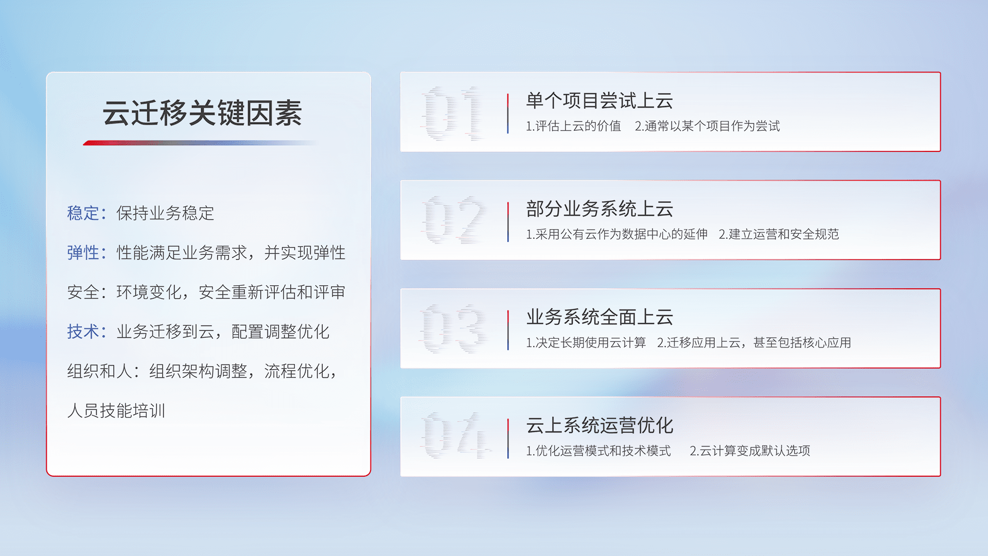 结合实际业务,,,,从规划设计、、、云平台选型、、、云原生改造、、数据迁移、、集成交付,,,迁移全过程为客户识别最佳上云路径,,,做好风险识别管理,,设计网络架构、、、身份权限、、安全审计合规、、操作审计、、、日志审计、、、、监控告警策略、、多站点容灾设计等,,,,对云上基础设施进行整体规划,,,提升IT治理水平,,,,以满足弹性、、高可用、、、、高性能的需求。。。。