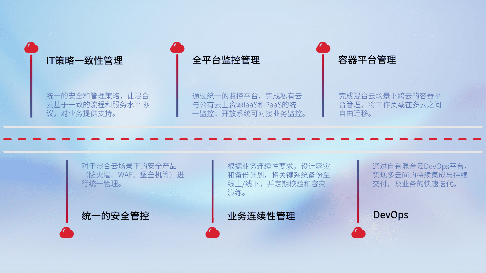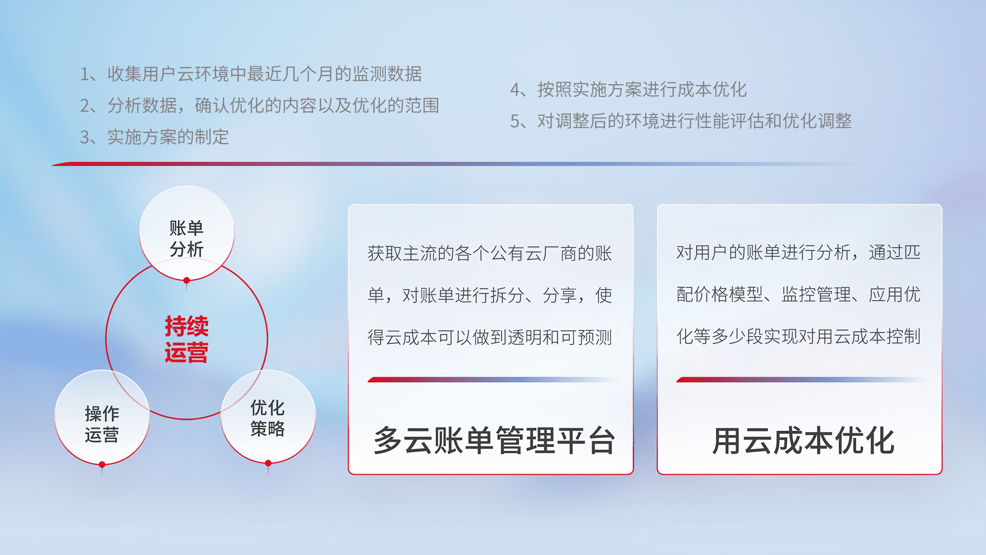 通过多云纳管,,以统一的资源数据模型把客户的云资源进行抽象和封装,,进而实现对多云资源的统一操作,,,保障云资源管理的可靠性、、、稳定性与可用性。。。量身定制化运维内容,,配置、、、开发运维、、、补丁管理、、、备份、、监控、、、认证和访问管理、、审计和日常巡检等,,保障在用云过程中的可靠度,,,稳定度以及高可用率。。。。
