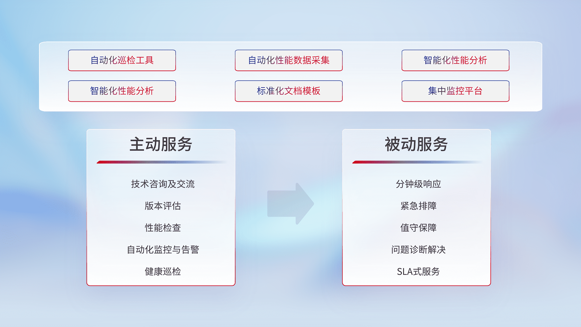 智能化工具和标准化文档,,,,保障服务质量,,,,提供主动服务(包含技术咨询、、、、版本评估、、、、性能检查、、、自动化监控与告警、、、健康巡检)和被动服务包含(分钟级响应、、、紧急排障、、、值守保障、、、、问题诊断解决、、SLA服务)。。。